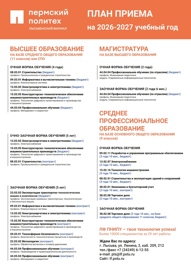 618900, Пермский край, г. Лысьва, ул. Ленина, д. 2, к. 214, тел. +7 (34249) 61255, e-mail: pts@lf.pstu.ru